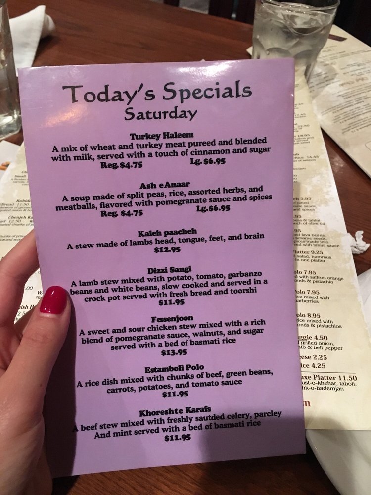 Appetizers: Kashk O Bademjaan( eggplant dip), Most O kheyar( yogurt & cucumber dip), pita bread.Trio Basmati rice Platter: Shireen Polo(orange peels,carrots, and nuts), Albalo Polo( sour Cherries), Zereshk Polo( Barberries and Saffron)Mixed Grill: 5 pieces of Rack of lamb, 2 Skewers of chicken Kabob, 2 skewers of Kubideh Kabob( ground sirloin), and Veggie kabob.Dessert: A Baklava Platter for 4